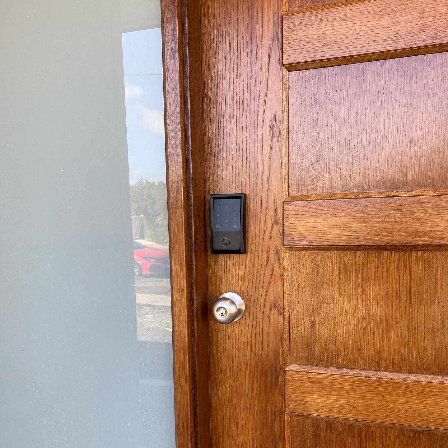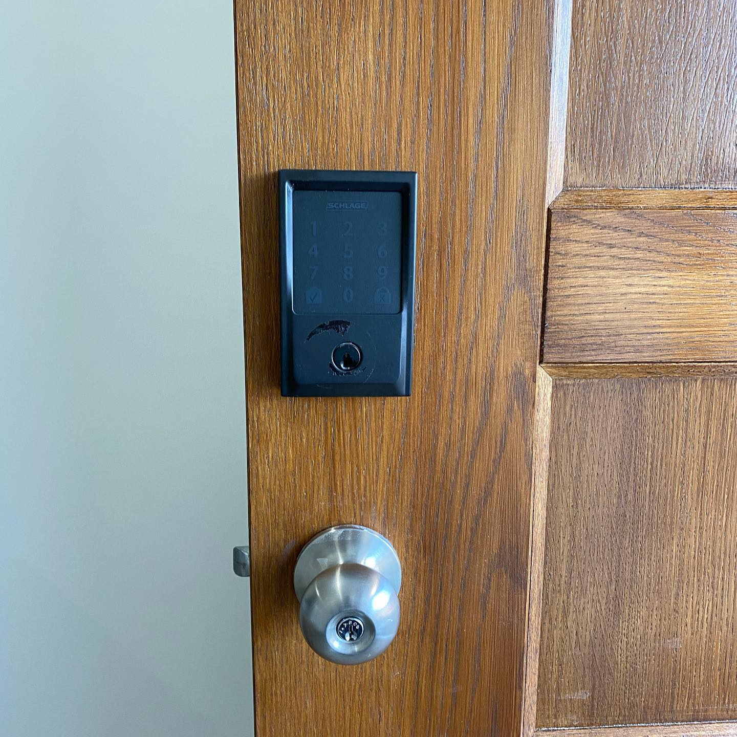Schlage encode Smart Deadbolt, on a squeaky door, excuse the old scars on the door. #allegion #schlagesmartlock #tlcsecurity #locksmithessendon #keylessentryButton