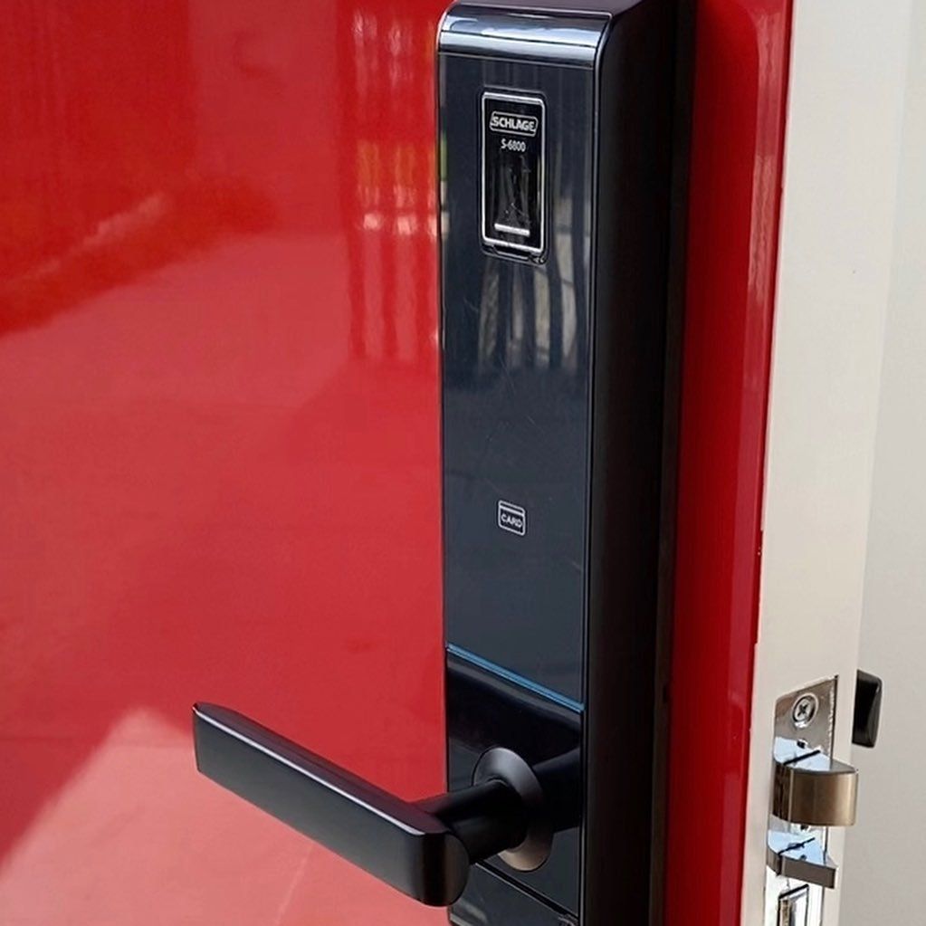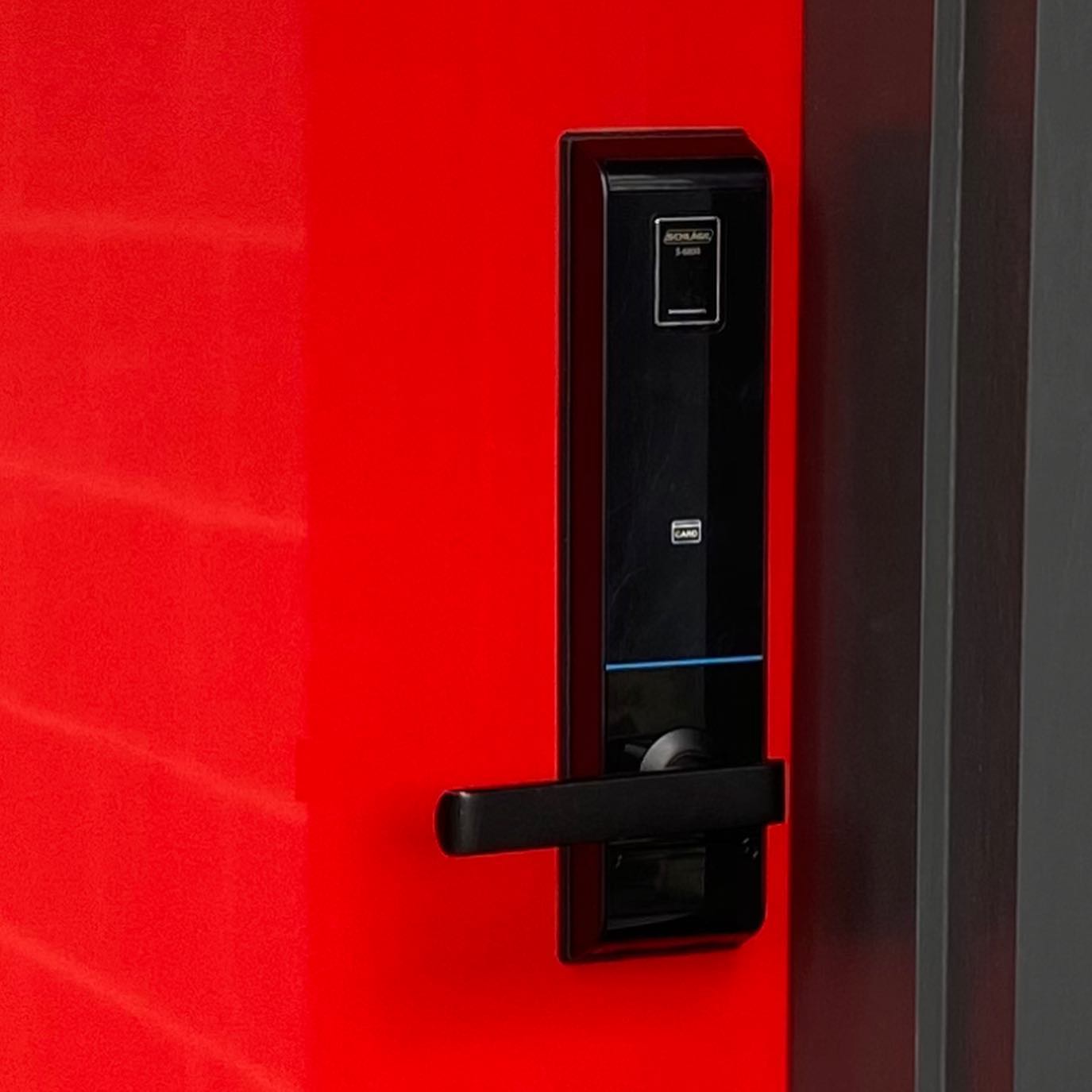 Schlage Omnia Smartlock, matte black looks great on the Red door. #locksmithessendon #tlcsecurity #smartlockinstallation #keylessentry #rfidlock #fingerprintlockButton