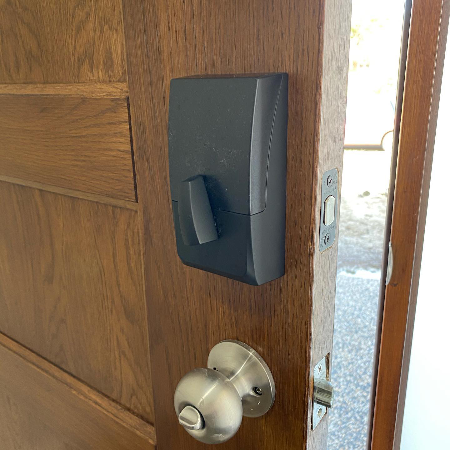 Smarteck A220 Deadbolt from Electronic Locks Australia, looks great with the existing handle. #pincodelock #keylessentry #locksmithessendon #tlclocksmiths #smartlock #smartlockinstallation #mattblackButton